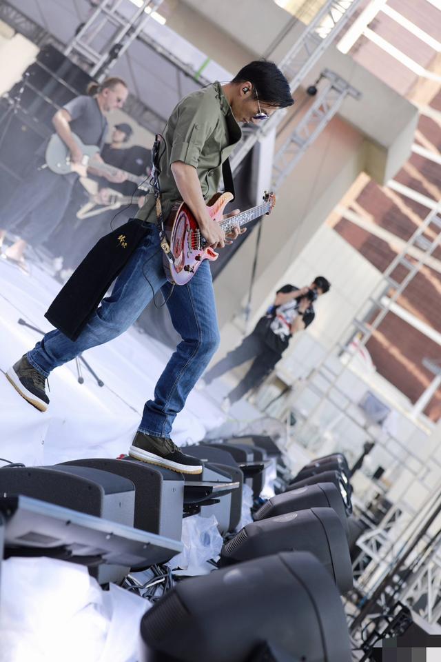 拿着吉他的谢霆锋,像足了年轻的音乐少年们在舞台上的表现。绿色的短袖上衣看起来很厚实,其实却很有型,大领子的设计为穿着者遮挡住了颈部线条的不完美,将颈部线条拉长,看起来很美观。肩部的硬缝合使这件衣服更加突显肩膀的宽度和形状,增加了穿着者的棱角感。袖口的扣子使这件衣服更加帅气有型。蓝色牛仔裤随意简单,很接地气。