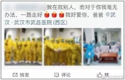 30日,一直奋战在抗疫一线的武汉市武昌医院护士发微博称,自己的父亲不幸因病去世,而那一刻她正在抗疫一线,努力挽救新型冠状病毒感染肺炎患者的生命,这位护士称“我在救别人,而对于你我毫无办法,一路走好,我好爱你,爸爸。”