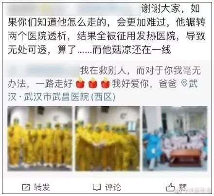 随后,这位护士在个人微博上表示,因为目前武汉严峻的疫情防控形势,原本他父亲进行透析治疗的两家医院都被设定为发热定点医院专门用于收治新型冠状病毒感染的肺炎患者,结果自己的父亲没有地方透析。