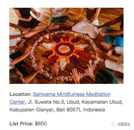 第一种叫Meditation and Yoga 101,意为“冥想瑜伽第一课”。这种产品非常简单,一般都是第一次去巴厘岛的游客报名参加,三到七天的套餐,每天上午练练瑜伽、下午打坐,中间吃吃当地美食,享受下便宜的按摩足浴。如此重复几天,最贵也不超过5000人民币。