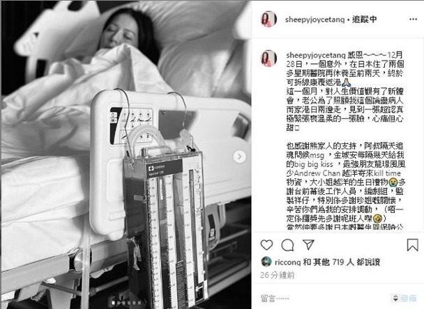 1月31日,据香港媒体报道,TVB女演员滕丽名突然在社交平台晒出了躺在病床及坐轮椅的医院照,情况令人忧心,其配文:“感恩~~~12月28日,一个意外,在日本住了两个多星期医院再休养至前两天,终于可拆线康覆(复)返港”,字里行间向外界表明,她在日本期间受伤发生了事故,一住还是两个多星期,但是没有说明发生了什么事情。