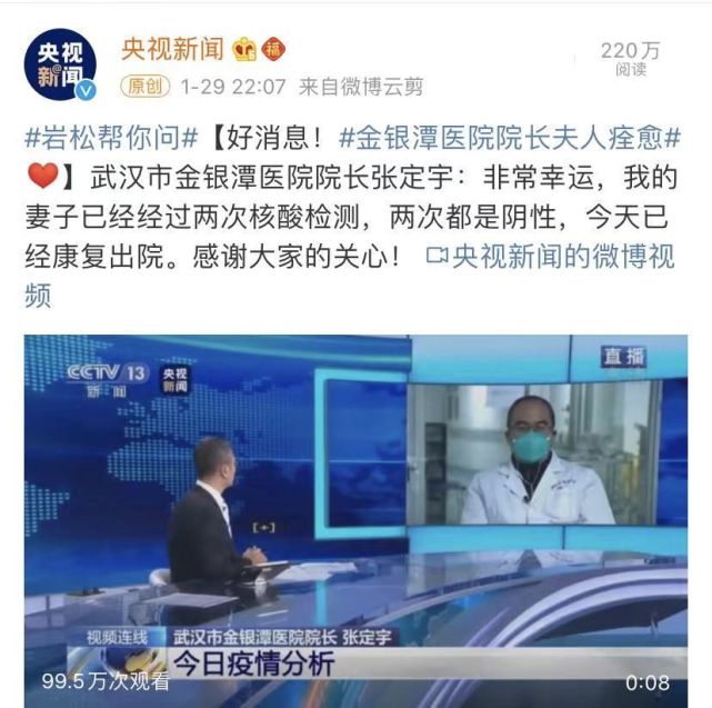 据@央视新闻 ,武汉市金银潭医院院长张定宇在与白岩松的视频连线中表示:非常幸运,我的妻子已经经过两次核酸检测,两次都是阴性,今天已经康复出院。感谢大家的关心!