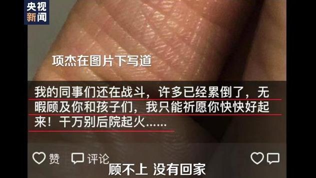 项杰在微信朋友圈写道:“我的同事们还在战斗,许多已经累倒了,无暇顾及你和孩子们,我只能祈愿你快快好起来!千万别后院起火。”