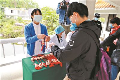 “谢谢,辛苦你们了。”2月2日上午10时,在番禺疗养院,工作人员为刚刚拿到“解除医学观察告知单”的23人送上防流感香囊和祝福。“祝你身体健康!”工作人员双手递上一对香囊,红艳艳的香囊上绣着“福”字。“谢谢你们!”不少人接过香囊后,轻轻鞠躬表示感谢。