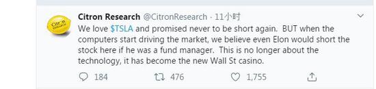 香橼在推特(33.96, 0.89, 2.69%)上发帖称:“我们爱特斯拉,并承诺永远不再做空。但当电脑开始推动市场时,我们相信即使是埃隆,如果他是一名基金经理的话,也会在这里做空这只股票。这不再是关于技术,它已经成为新的华尔街赌场。”