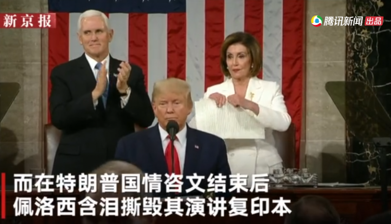 演讲结束时,站在特朗普身后、身着白衣的美国众议院议长佩洛西当着现场和电视镜头前全美观众的面,面无表情地撕掉了特朗普国情咨文的副本。