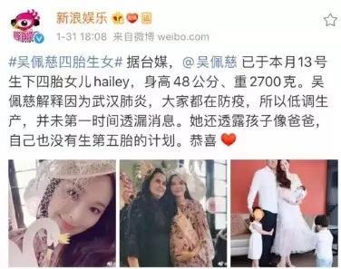 据媒体透露,吴佩慈这一胎是个女儿,名字叫作hailey,身高48公分,重2700克。接受采访时吴佩慈说,孩子长得很像她父亲,并表示没有第五胎的计划。