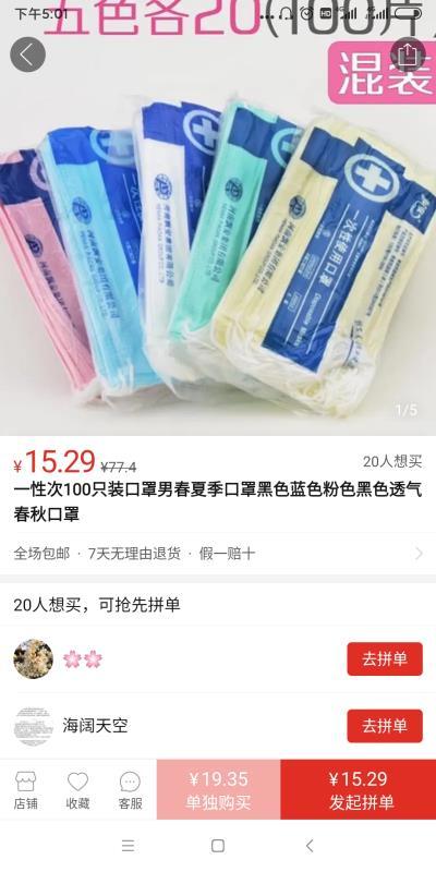 新京报记者注意到,即使在这种情况下,仍有电商通过变更商品信息、错开关键词等销售假“飘安”口罩,所售口罩颜色各异,有黑色、粉红色、黄色等,甚至还有商家在商品详情页面标出假一赔十、七天无理由退货字样。
