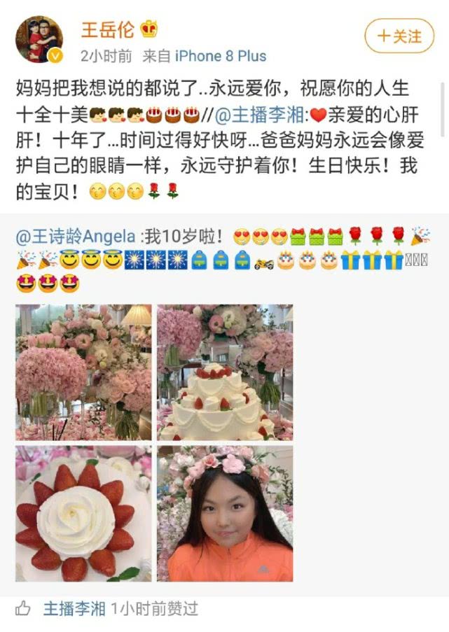 2月10日,李湘在个人社交网站上晒图庆祝自己的44岁生日,并配文称:“已经在家呆了17天了!2020过了一个不一样的生日!祝福祖国平平安安!大家一起团结一心!早日打赢这场战争!”在李湘的照片仅仅发布7分钟后,王岳伦就马上转发并配文称:“老婆生日快乐”,反应非常快速,看得出来夫妻感情非常好。