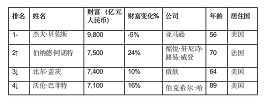 4人财富突破1000亿美金,史上最多。比尔•盖茨和沃伦•巴菲特分别以7,400亿和7,100亿人民币位列第三第四。前十名财富总和接近1万亿美元