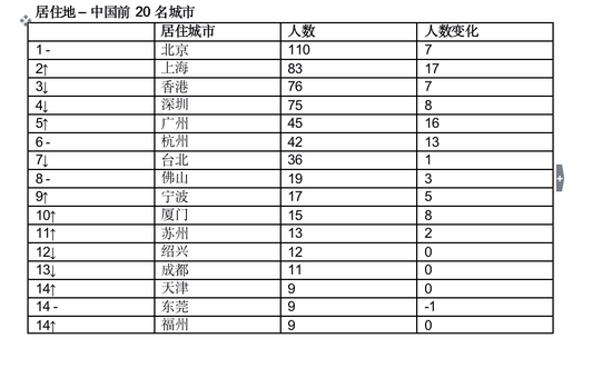 北京连续五年成为全球十亿美金企业家之都,共有110位居住在北京,比纽约多出12位。上海超过香港位列第三。香港跌至第四。广州新进前十名,宁波新进前30名。粤港澳大湾区共有232人上榜,比去年增加35人