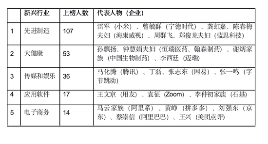 新兴行业比例逐渐上升。全球富豪榜中,通过新兴行业积累财富的中国企业家占比达32%,从事传统行业的占比68%。在新兴行业上榜企业家中,来自于先进制造行业的人数最多,有107位,占新兴行业上榜企业家总人数的41%。排在该行业首位的是小米的雷军,其次是宁德时代的曾毓群和海康威视(37.750, -0.60, -1.56%)的龚虹嘉、陈春梅夫妇。