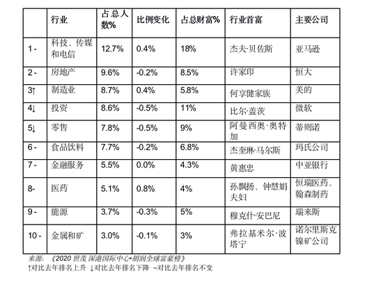 科技是主要财富来源,其次是房地产、制造业、投资和零售业。前五大行业上榜人数占整张榜单的一半
