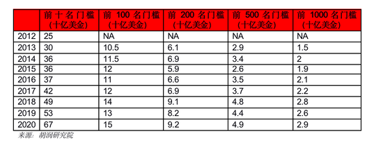 进入前1000名的门槛比去年提高7.7%。进入前十名的门槛达到创纪录的640亿美元,比五年前高出80%。