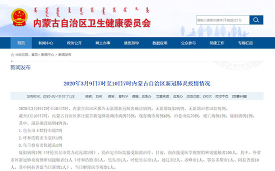 截至3月10日7时,内蒙古自治区累计报告新冠肺炎确诊病例75例,现存确诊病例4例,治愈出院70例,死亡病例1例,疑似病例1例。