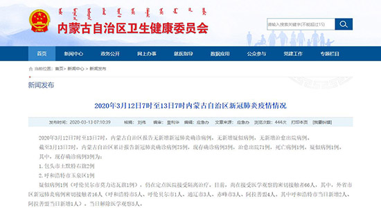 人民网呼和浩特3月13日电 (陈立庚)3月13日,记者从内蒙古自治区卫生健康委员会获悉,2020年3月12日7时至13日7时,内蒙古自治区报告无新增新冠肺炎确诊病例,无新增疑似病例,无新增治愈出院病例。