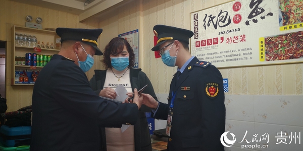 疫情形式逐渐向好,贵州桐梓县市场监管部门人员到当地餐馆开展防疫宣传。赵军 摄