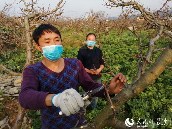 贵阳市南明区永乐乡干井村村民陈兰军为桃树修枝。南明区委宣传部供图