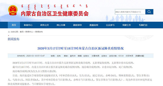 人民网呼和浩特3月18日电 (陈立庚)3月18日,记者从内蒙古自治区卫生健康委员会获悉,2020年3月17日7时至18日7时,内蒙古自治区报告无新增新冠肺炎确诊病例,无新增疑似病例,无新增治愈出院病例。
