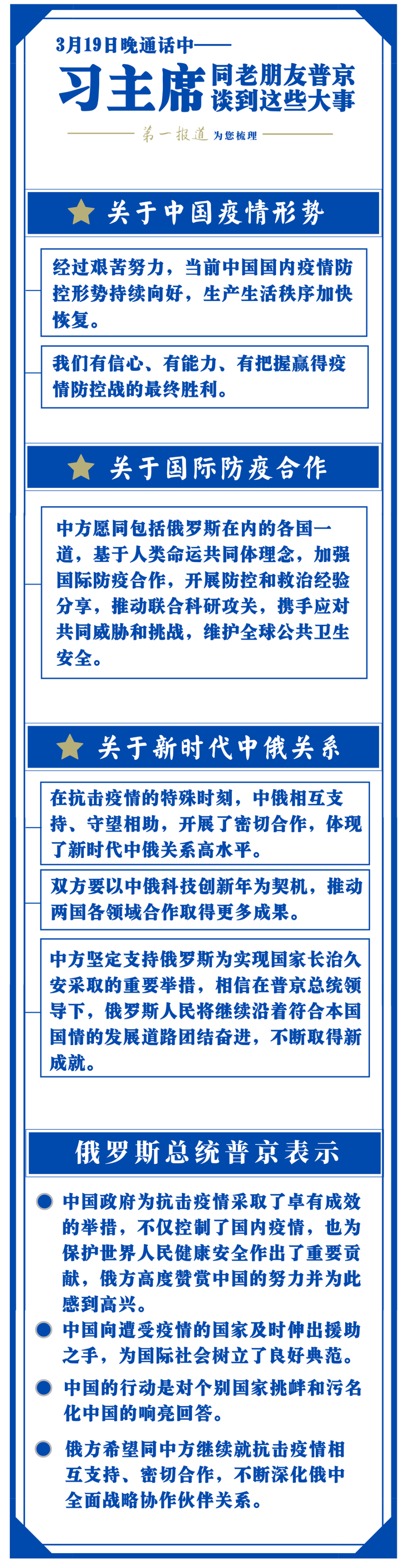 这次中俄元首通话,信息量很大。习主席主要讲了三方面的事:关于中国疫情形势,关于国际防疫合作,关于新时代中俄关系。具体内容,“第一报道”为您梳理: