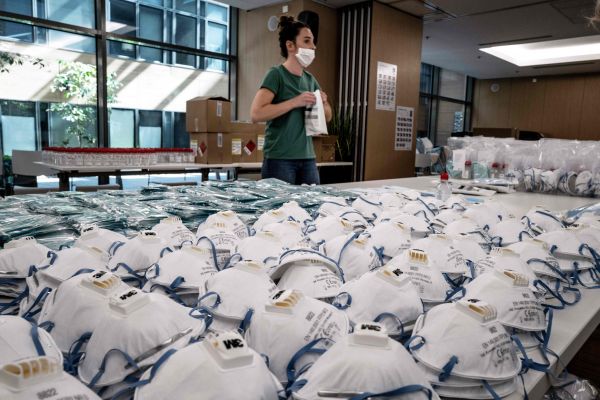 3日在法国里昂,当地工作人员清点抗疫物资。(法新社)