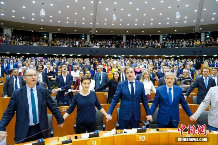 资料图:当地时间2020年1月29日,欧洲议会批准“脱欧”协议。投票结束后,在场议员手拉手唱起苏格兰经典歌曲《友谊地久天长》,以这首家喻户晓的“离别之曲”送别英国。中新社发 欧盟供图