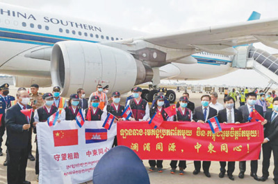 柬埔寨首相洪森的社交媒体账号视频直播了中国专家组抵达的情景。当地媒体称,中国的帮助凸显了柬中同心抗疫、共克时艰的深情厚谊。这支援柬抗疫医疗专家组由7人组成,他们的专业包括疫情防控、临床诊疗、实验室检测等。随他们一同抵达的,还有口罩、防护服、红外线体温枪等医疗物资。