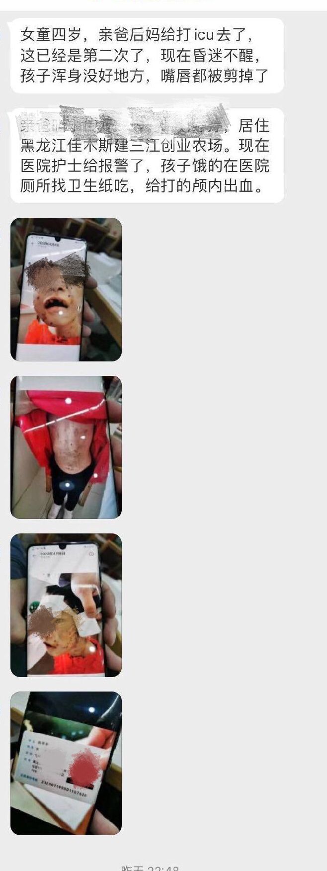新京报此前报道,4月23日,凡凡因“颅脑损伤”被送进医院,情况危急。知情人透露,凡凡是2020年春节后刚从爷爷奶奶家来到建三江,开始与父亲和继母一起生活,不久后凡凡便一身伤, “烟头烫的、刀片划的,脸上也被划伤,脑门上有一块很大的伤疤,上嘴唇被剪刀剪伤,脚底全是冻疮”。建三江农垦公安局副局长杜维军表示,刑侦部门已立案侦查。