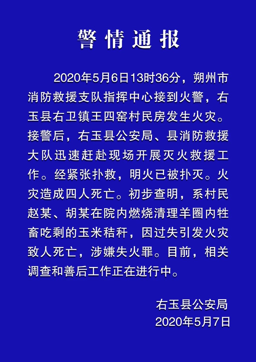 原标题:关于右玉县右卫镇王四窑村发生火灾的情况通报)