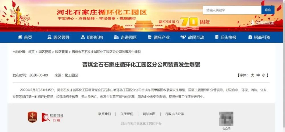 2020年5月8日23时35分,河北石家庄循环化工园区晋煤金石石家庄循环化工园区分公司合成车间甲醇回收装置发生爆裂,园区主要领导和分管领导,以及应急、环保、消防、公安、交管等部门第一时间赶赴现场,经现场初步核查,无人员伤亡,未发生有毒可燃气体泄漏,周边企业未受到影响,现场处置工作正在进行中。