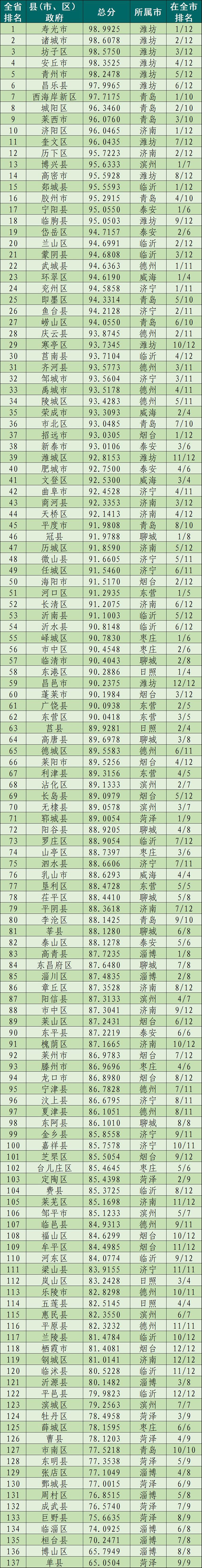 本次评估的137家县(市、区)政府中,潍坊市寿光市名列第1,潍坊市诸城市、潍坊市坊子区、潍坊市安丘市、潍坊市青州市、潍坊市昌乐县、青岛西海岸新区、青岛市城阳区、青岛市莱西市、济南市济阳区分列第2位到第10位。