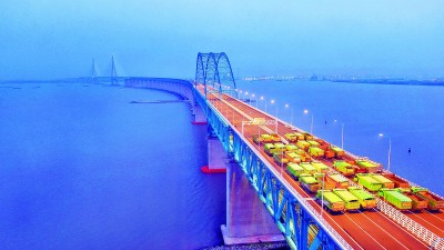 沪通长江大桥是我国沿海铁路大通道中通沪铁路的跨长江控制性工程,建成后将进一步完善区域交通运输结构、提高过江通道运输能力、促进长三角经济社会一体化发展。图为日前进行的沪通长江大桥荷载试验。许丛军摄/光明图片