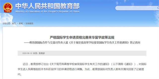 【环球网】近日,教育部修订出台《关于规范我高等学校接受国际学生有关工作的通知》,对国际学生进入我高等院校本专科阶段学习的申请资格进行调整。