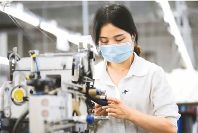 疫情发生以来,贵州省黔东南苗族侗族自治州锦屏县金融机构对辖区内企业加大资金投放力度,降低企业融资成本,激活企业活力。目前,锦屏县累计向辖区内企业发放贷款1.5亿余元。贵州飘雅服饰有限公司获得流动资金贷款,用于扩大产能需要。图为该公司工人在生产车间工作。杨晓海摄(人民视觉)