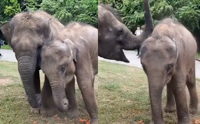 视频中的大象用鼻子给另一只小象做沙浴,娴熟的手法一看就是老手,小象一脸享受的表情。