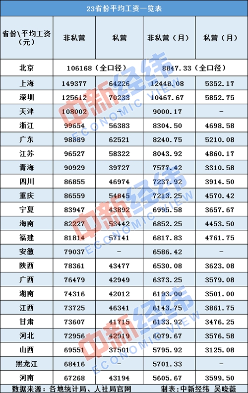 根据中新经纬客户端计算,除北京外,22省份非私营与私营单位的平均月薪分别在5605-12448元、3125-5852元之间。