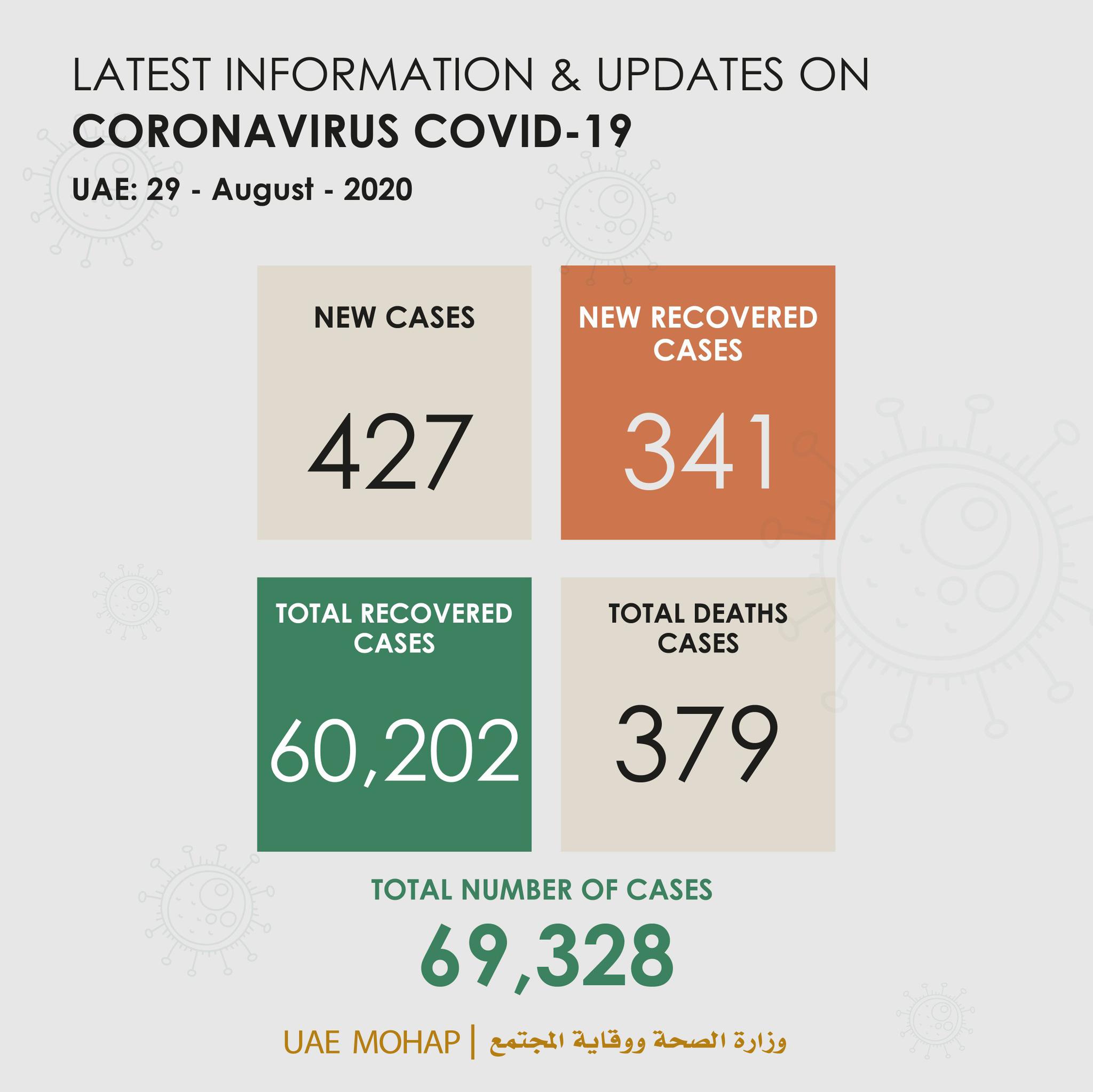 当地时间8月29日,阿联酋卫生和预防部通报该国新增427例新冠肺炎确诊病例,同时新增341例治愈病例,无新增死亡病例。至此阿联酋境内新冠肺炎确诊病例累计达69328例,其中治愈病例60202例,死亡病例379例。