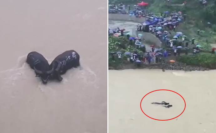 全球报道:水牛暴雨中打斗双双跳入洪水 围观人群站满河岸场面壮观