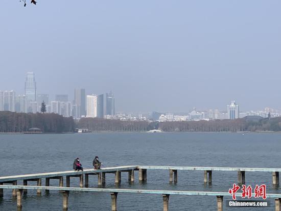资料图:1月29日,天气放晴,一些市民来到位于武汉大学凌波门外的东湖栈桥上,佩戴口罩垂钓。 中新社记者 杨程