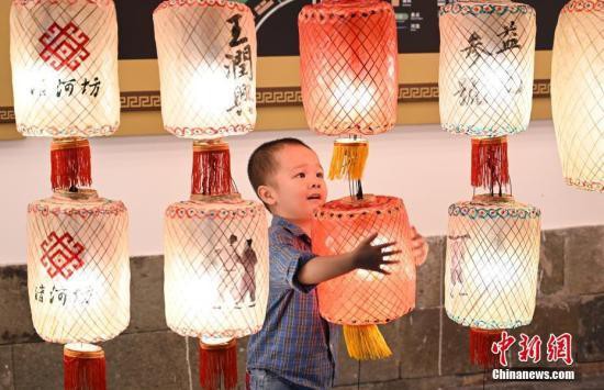 9月28日,一名小朋友被挂在杭州河坊街的灯笼吸引。中秋、国庆假期将至,浙江杭州的河坊街、西湖边等多处挂起灯笼。中新社记者 张茵 摄