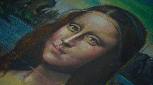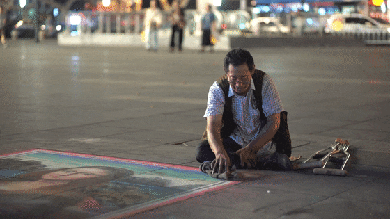 过去30多年里,在北京、广东、重庆等地的街头,有人不时看到一个4平米的巨大《蒙娜丽莎》在地面上微笑。画作周围聚集着几十号围观群众。人群中间,有一个人的手在不停描绘。他几乎匍匐在地上,满身粉笔屑,因为他只有一条腿。