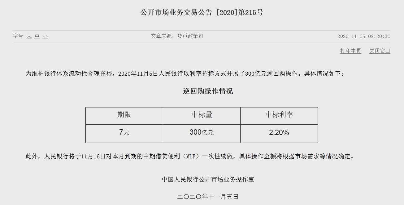 中新经纬客户端11月5日电 5日央行公告称,为维护银行体系流动性合理充裕,以利率招标方式开展了300亿元7天期逆回购操作,中标利率2.20%与此前持平。据统计,央行16个工作日累计逆回购规模达12200亿元。此外,人民银行将于11月16日对本月到期的中期借贷便利(MLF)一次性续做,具体操作金额将根据市场需求等情况确定。