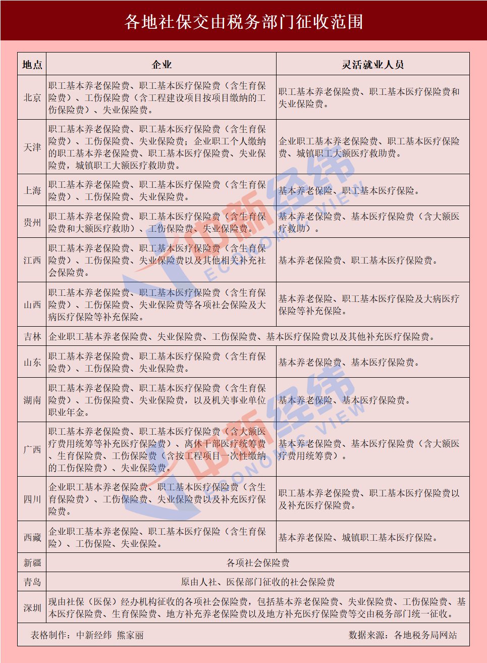 中新经纬客户端查询各地税务部门网站发现,近日,北京、天津、上海、贵州、江西、山西、吉林、山东、湖南、广西、四川、西藏、新疆等13省份,以及青岛、深圳2个计划单列市陆续发布公告称,企业职工各项社会保险费交由税务部门统一征收。