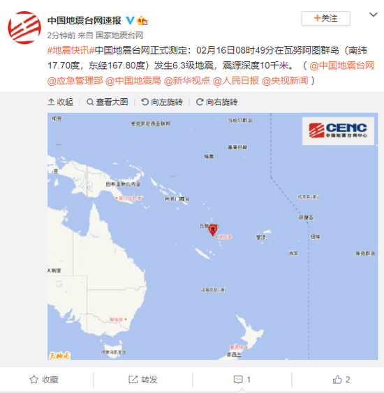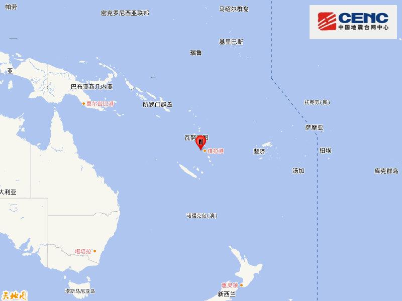 中国地震台网正式测定:02月16日08时49分在瓦努阿图群岛(南纬17.70度,东经167.80度)发生6.3级地震,震源深度10千米。