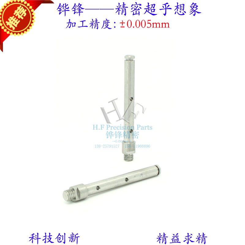 中国广东省惠州市惠城区汝湖镇水苑工业区铧锋精密,专业为全球客户定制各类精密零件,我司可以定制的产品材质有不锈钢、铜、铝、铁、PEEK、POM、钛合金TC4,洛钢,45#钢等等,我司拥有数十台进口4轴、5轴、7轴联动的车铣钻复合数控加工设备,精雕设备,线切割,加工中心,电火花等,可以一次性加工各种孔,包括偏心孔,斜孔,深孔,台阶,侧铣,端铣,细孔,微型孔,镜面效果等等,我司拥有双主轴同时加工的复合型设备,只要在设备加工范围内,任何产品一次装夹完成,保证精度和外观和同心度。此款精密不锈钢传动轴是一家做电子设备的企业为自己的产品定制的,产品有一个槽口,两个侧孔,一个大外径,一个螺牙,一个扁位构成,难点就是产品比较长,要保证产品每个环节的同心度,如果用普通的数控设备肯定做不到非常的同心,我司采用进口4轴联动走心机对产品进行一次性加工,不但保证了精度,平面度,同心度,而且还保证了外观的漂亮,并且和我司一直合作的氧化厂也可以保证我们的氧化后的精度在0.01mm内,所以我们的产品发给客户后,对我们的产品赞扬有加,目前一直在和铧锋保持着紧密的合作关系,铧锋欢迎广大新老客户前来定制各类精密零件。