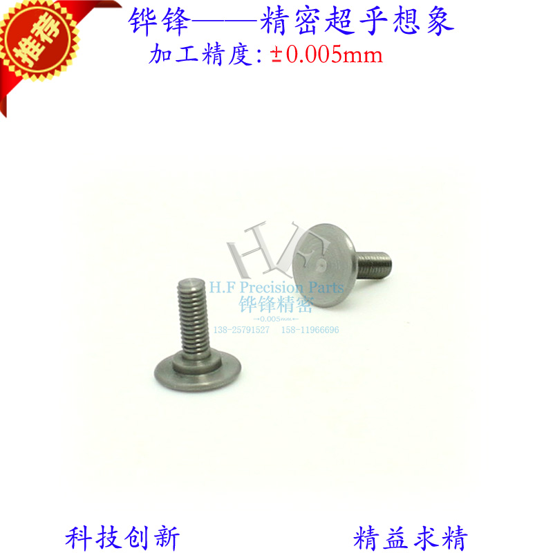 中国广东省惠州市惠城区汝湖镇水苑工业区铧锋精密,专业为全球客户定制各类精密零件,我司可以定制的产品材质有不锈钢、铜、铝、铁、PEEK、POM、钛合金TC4,洛钢,45#钢等等,我司拥有数十台进口4轴、5轴、7轴联动的车铣钻复合数控加工设备,精雕设备,线切割,加工中心,电火花等,可以一次性加工各种孔,包括偏心孔,斜孔,深孔,台阶,侧铣,端铣,细孔,微型孔,镜面效果等等,我司拥有双主轴同时加工的复合型设备,只要在设备加工范围内,任何产品一次装夹完成,保证精度和外观和同心度。此款精密大柄螺丝是由一家专业生产喷码设备的厂家定制的,产品由进口的易车铁制作而成,产品最大直径为16mm,最小的螺牙只有M3大小,要保证产品的牙与大直径的同心度,并且端面不能有凸台,这种情况下,如果用普通的数控车床是保证不到的,我司采用进口4轴联动走心机对产品进行一次性加工,不但保证了精度,平面度,同心度,而且还保证了外观的漂亮,并且和我司一直合作的氧化厂也可以保证我们的氧化后的精度在0.01mm内,所以我们的产品发给客户后,对我们的产品赞扬有加,目前一直在和铧锋保持着紧密的合作关系,铧锋欢迎广大新老客户前来定制各类精密零件。