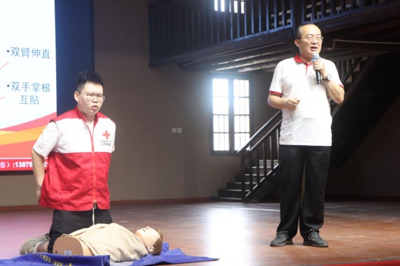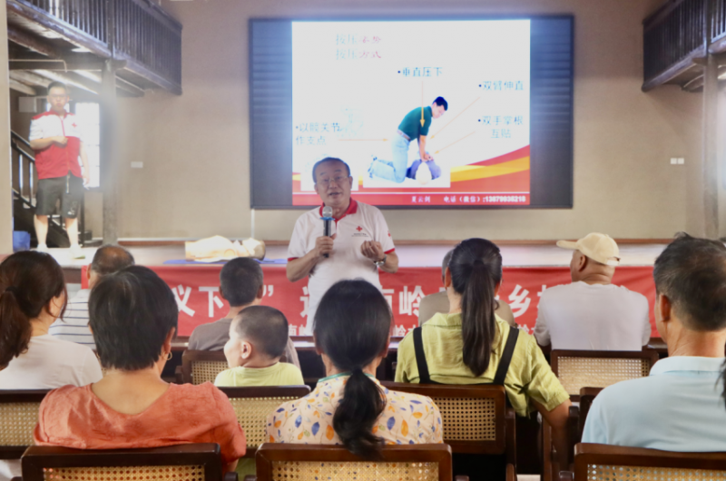 活动现场气氛热烈而专注。“若遇到有人突然晕倒,首先需判断其有无意识丧失、呼吸、脉搏消失……”主讲老师夏云剑的声音清晰、洪亮而有力,他借助精心准备的模拟人、AED(除颤仪)等教具,将心肺复苏术的每一个细节都展现得淋漓尽致。从判断患者状态到正确的按压位置、按压频率和深度,再到人工呼吸的要领,夏云剑老师无一不进行了详尽的讲解。他的讲解不仅有理论知识,更有丰富的实践经验和生动的案例分享,让村民们仿佛置身于真实的急救场景之中。