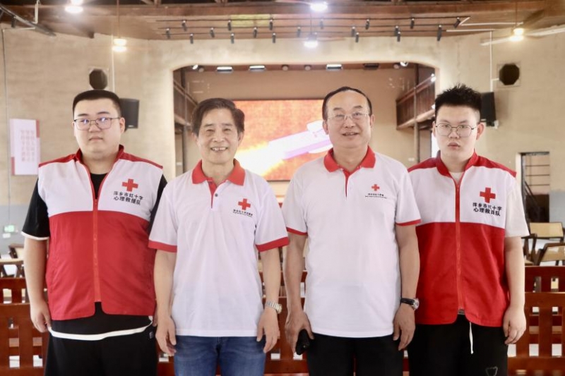 上图左起:红十字志愿者彭奕天、邓利萍和夏云剑老师及志愿者文熠聪现场合影。