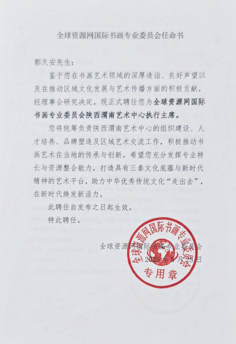 为深入贯彻中华优秀传统文化的传承发展战略,进一步加强全球资源网国际书画专业委员会在西北地区的组织体系建设,拓展地方艺术资源平台,推动陕西区域书画事业高质量发展,全球资源网国际书画专业委员会于2025年5月23日正式任命郭九安先生为陕西渭南艺术中心执行主席。