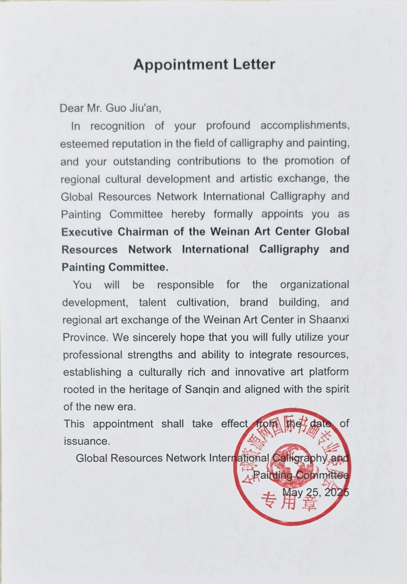 本次任命是全球资源网国际书画专业委员会在区域战略布局中的重要举措。作为执行主席,郭久安先生将全面负责陕西渭南艺术中心的组织建设、品牌推广、书画创作、人才引育、活动策划与国内外文化艺术交流等各项工作,推动中心成为汇聚三秦书画英才、联通全国艺术资源、展示地方文化魅力的重要平台。